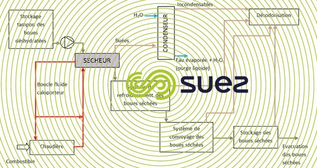 La vapeur d’eau générée par le séchage est condensée par refroidissement. Sauf cas particulier d’une plateforme de séchage hors station d’épuration, les condensats sont retournés en tête de station.